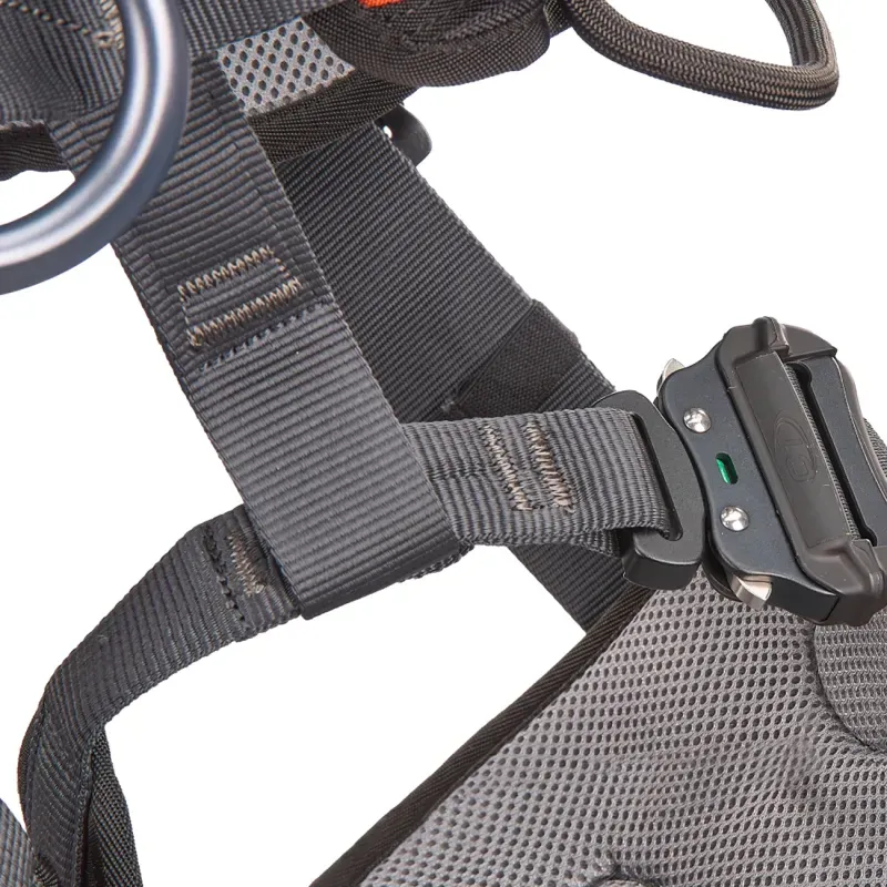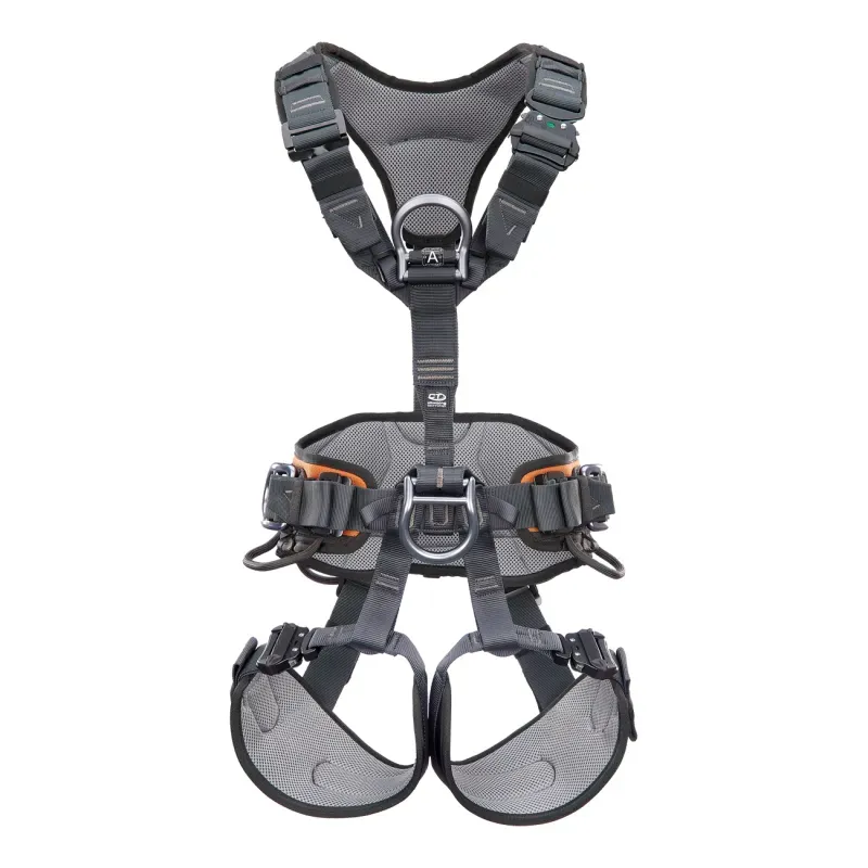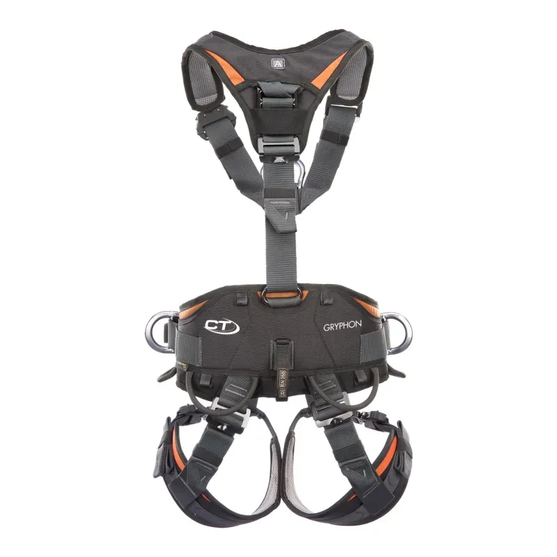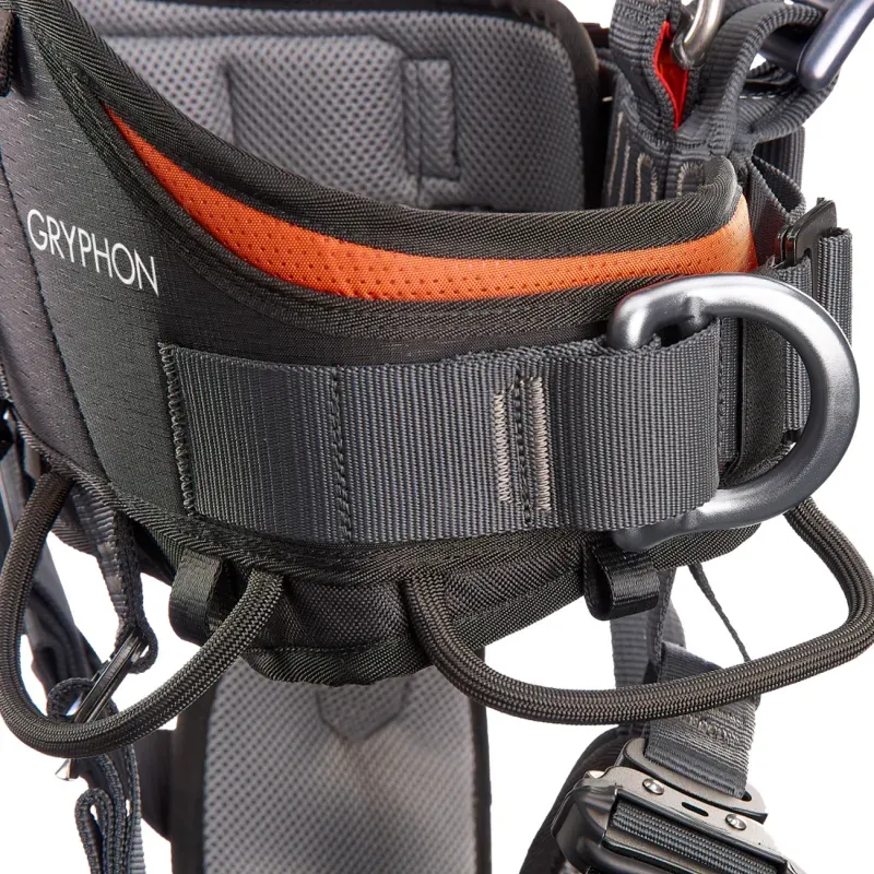 El arnés de seguridad GRYPHON es un equipo ergonómico de alta gama, diseñado para trabajos con cuerda que exigen máxima funcionalidad y comodidad prolongada. Cuenta con seis puntos de anclaje: esternal y dorsal (EN 361), laterales plegables (EN 358), y de suspensión tipo silla (EN 813), que lo hacen extremadamente versátil. Incorpora un cinturón de cadera ancho y acolchado con malla transpirable, hombreras de bajo perfil con hebillas de liberación rápida y perneras acolchadas que alivian la presión en la ingle. Su diseño incluye ojales para bloqueador torácico, asiento, HOOK REST, cuatro soportes grandes para material, seis ojales para herramientas y cuatro bucles para mosquetones, soportando hasta 140 kg. Fabricado con materiales de alta resistencia como poliamida, poliéster, acero y aluminio, es apto para usuarios entre 170 y 190 cm, con medidas de cintura entre 70 y 100 cm y de pierna entre 50 y 60 cm. Acredita cumplimiento con las normas EN 358:2018, EN 361:2002 y EN 813:2008, con una vida útil de hasta 10 años y resistencia térmica desde -20 °C hasta 60 °C.
